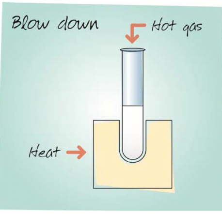 In these evaporator systems, an inert gas such as nitrogen is blown down through needles onto the samples in tubes to create a flow over the liquid surface. This alters the equilibrium between the vapour and liquid phases to favour the vapour phase. Heat is normally applied to the samples to hasten evaporation. Therefore the samples are hot during the process, being at the temperature of the heating block or bath, and consequently the technique offers poor recovery of volatile analytes. Although blow down evaporation is relatively fast for volatile solvents, it can be slow for solvents with high boiling points or those that are difficult to evaporate such as water. Blow down evaporation requires continuous monitoring by the user to detect the end point of the drying process and to optimise the position of the gas jets, keeping them close to the liquid surface.