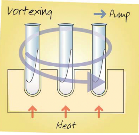 These systems boil batches of samples under vacuum and therefore the samples are cold throughout evaporation, while swirling the sample tubes to create a vortex. The vortex created generates a large sample surface area for evaporation, making the process relatively fast.