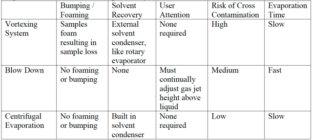 The systems were tested for their suitability for use in the sample preparation process, with particular attention to cross-contamination / bumping / foaming, solvent recovery and degree of user intervention. The results are shown below in Figure 2.